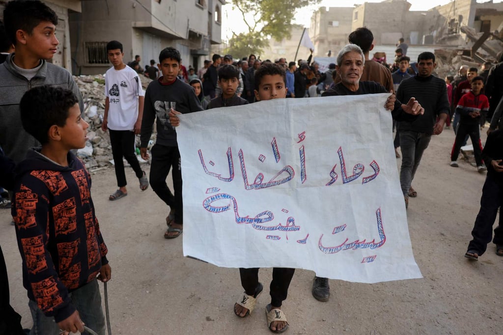 阿拉伯语标语牌写着:“我们孩子的鲜血不容践踏”。图片来源:法新社