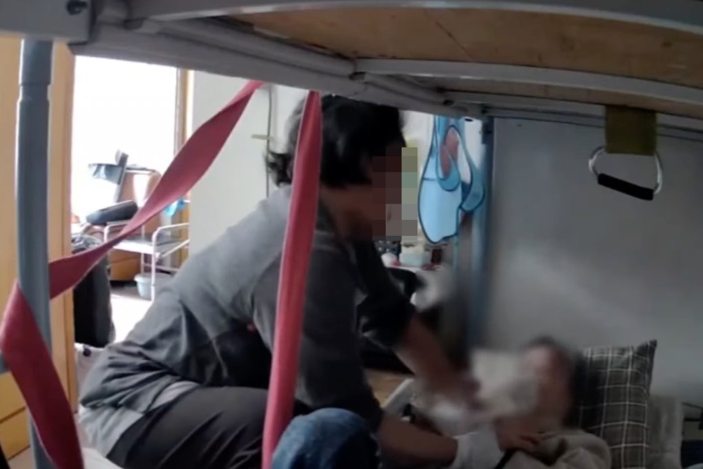 网络流传的监控画面显示,这名印尼籍佣工使用瑜伽绳捆绑81岁卧床老人的双手,期间多次将毛巾塞入老人口中。