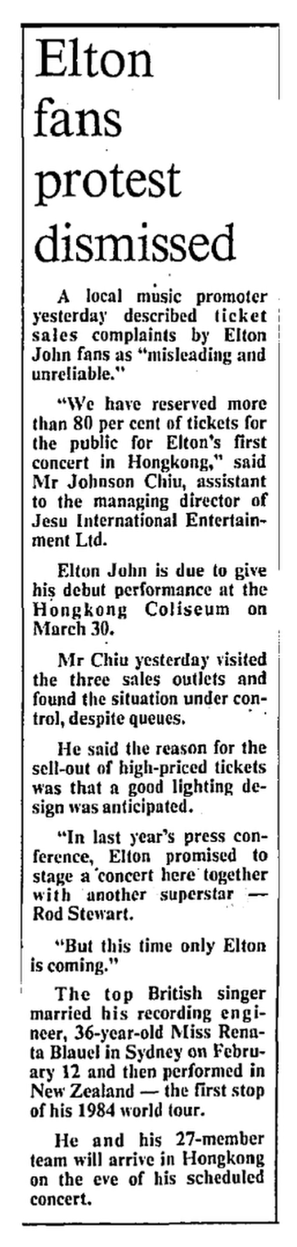 “一位本地音乐推广人昨日将埃尔顿·约翰粉丝关于票务销售的投诉描述为‘误导且不可靠’,”《南华早报》在1984年3月13日报道。“‘我们为埃尔顿在香港的首场演唱会预留了超过80%的票给公众,’Jesu国际娱乐有限公司董事总经理助理赵先生表示。埃尔顿·约翰定于3月30日在香港体育馆进行他的首场演出[…]高价票售罄的原因是预期会有出色的灯光设计。[约翰]和他的27人团队将在预定演唱会前夕抵达香港。”