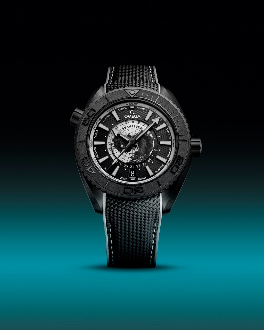 欧米茄海马系列海洋宇宙世界时腕表单色款采用灰色漆面,指针与时标覆以新型浅灰色Super-LumiNova夜光涂层。图片:品牌提供