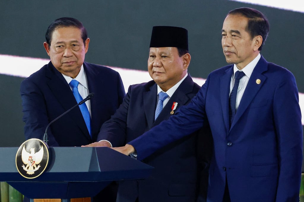 印度尼西亚前总统苏西洛·班邦·尤多约诺(左)、现任总统普拉博沃·苏比安托(中)与前总统佐科·维多多于2月24日在雅加达出席新主权财富基金——丹纳塔拉的启动仪式。照片来源:路透社