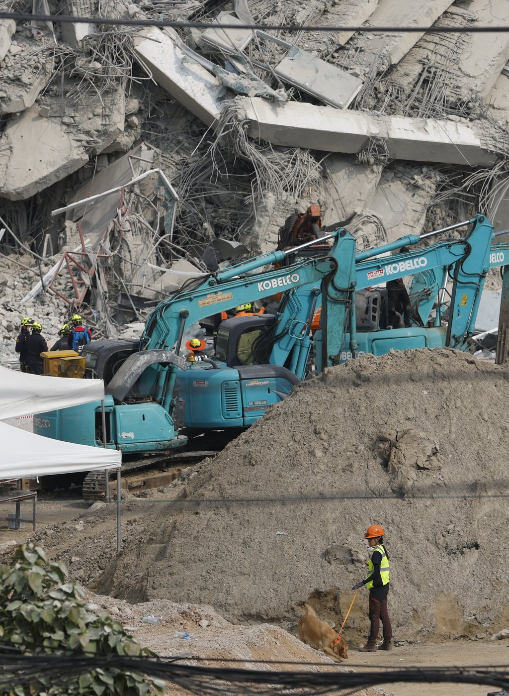 周六,泰国曼谷地震后,一名救援人员带着搜救犬在倒塌建筑现场寻找幸存者。照片:EPA-EFE