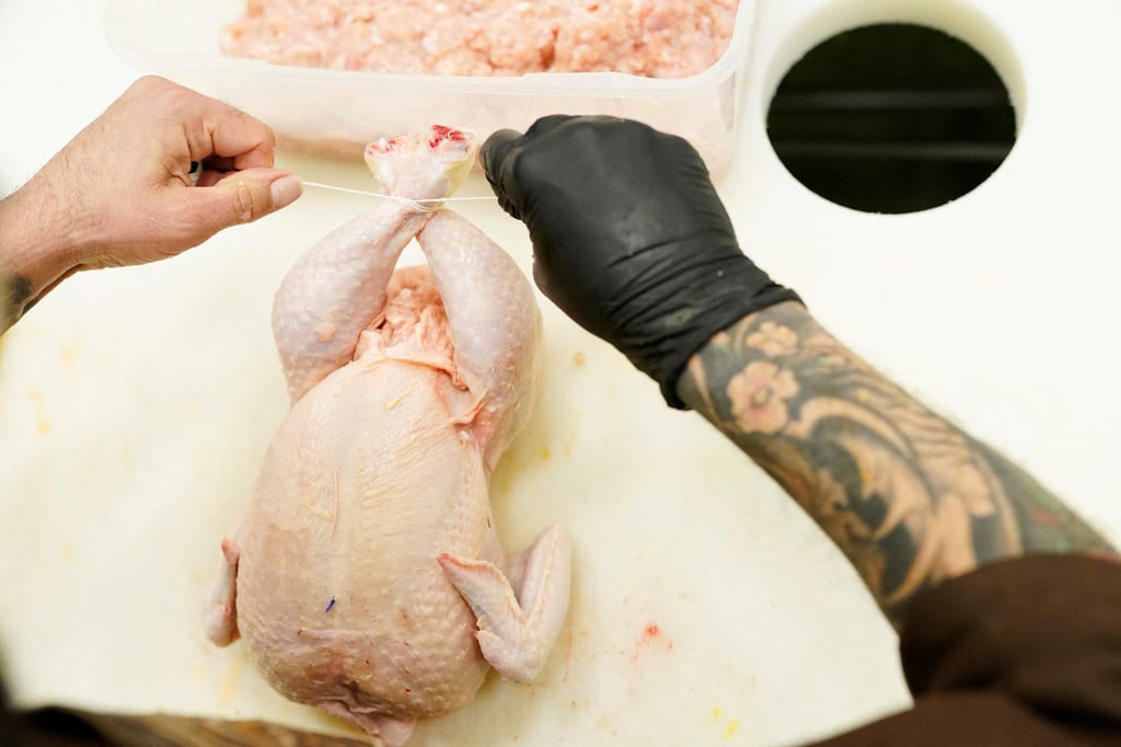 西班牙屠夫在备战3月31日巴黎世界屠夫挑战赛的彩排中捆扎鸡腿。图片来源:路透社
