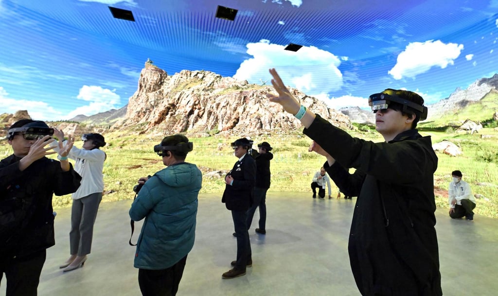2025年大阪世博会健康馆展区,参观者可通过AR眼镜体验卡普空热门游戏《怪物猎人》的世界。图:共同社
