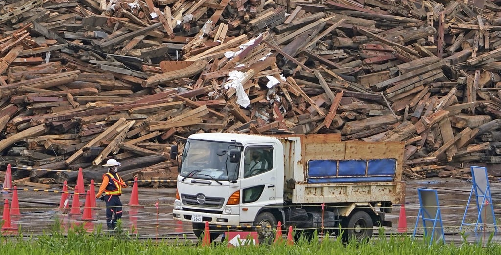 2024年1月1日能登半岛地震发生六个月后,废墟堆积在日本中部石川县珠洲市的临时垃圾处理场。照片:共同社