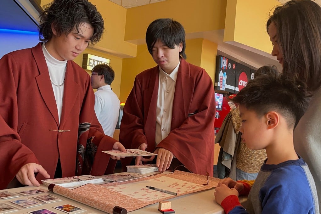 人们排队在一幅中国卷轴上签名,领取仿照中国传统绘画风格设计的电影票。还有人手持长矛宝剑合影留念。