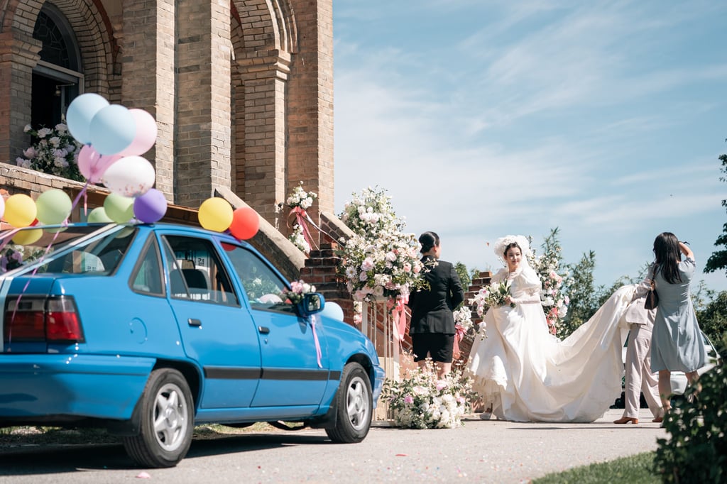 装饰华丽的蓝色婚车缓缓停在教堂前。