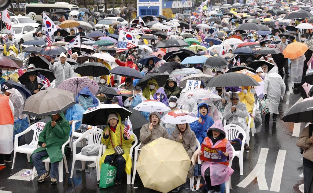 韩国宪法法院就尹锡悦12月3日颁布戒严令作出罢免判决次日(周六),其支持者在首尔举行集会。照片:共同社