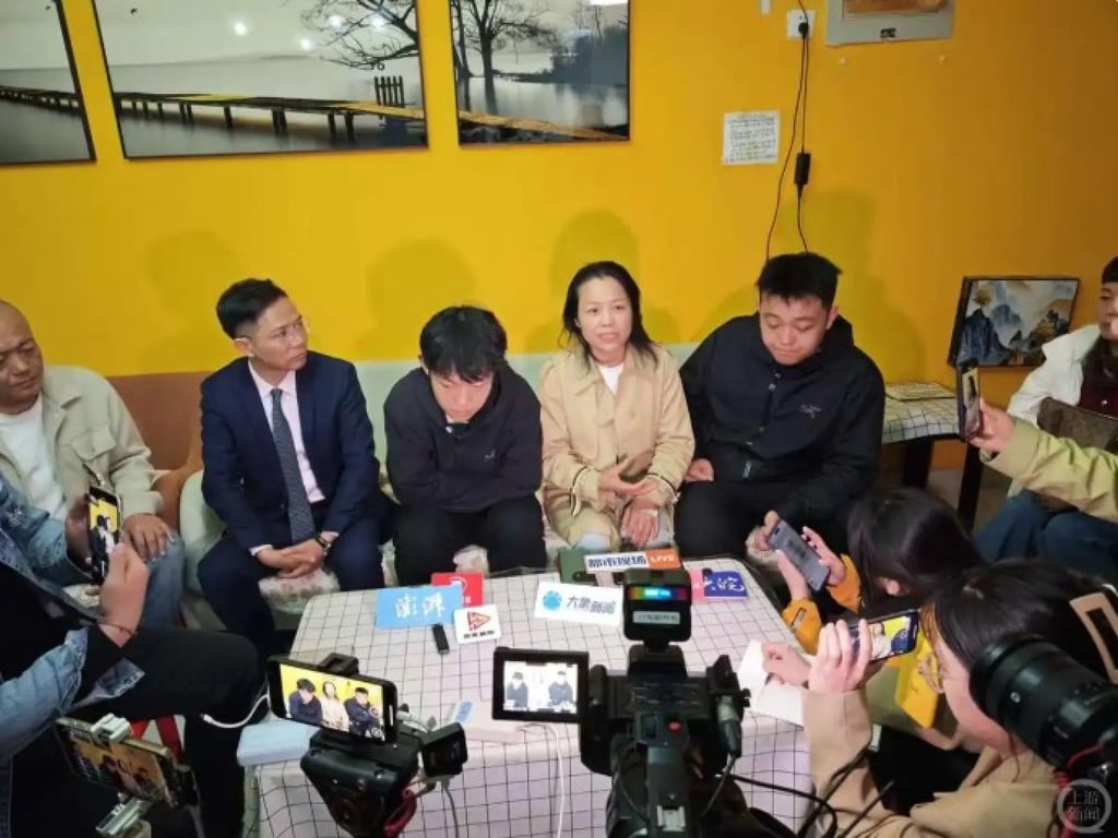 庭审结束后,母亲(右)与失散多年的儿子(中)共同面对媒体。图片来源:百度