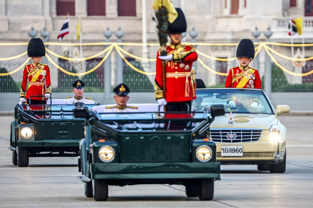 2024年12月3日,泰国国王玛哈·哇集拉隆功与王后苏提达在曼谷检阅仪仗队,参加庆祝国王72岁生日的皇家阅兵仪式。照片:路透社
