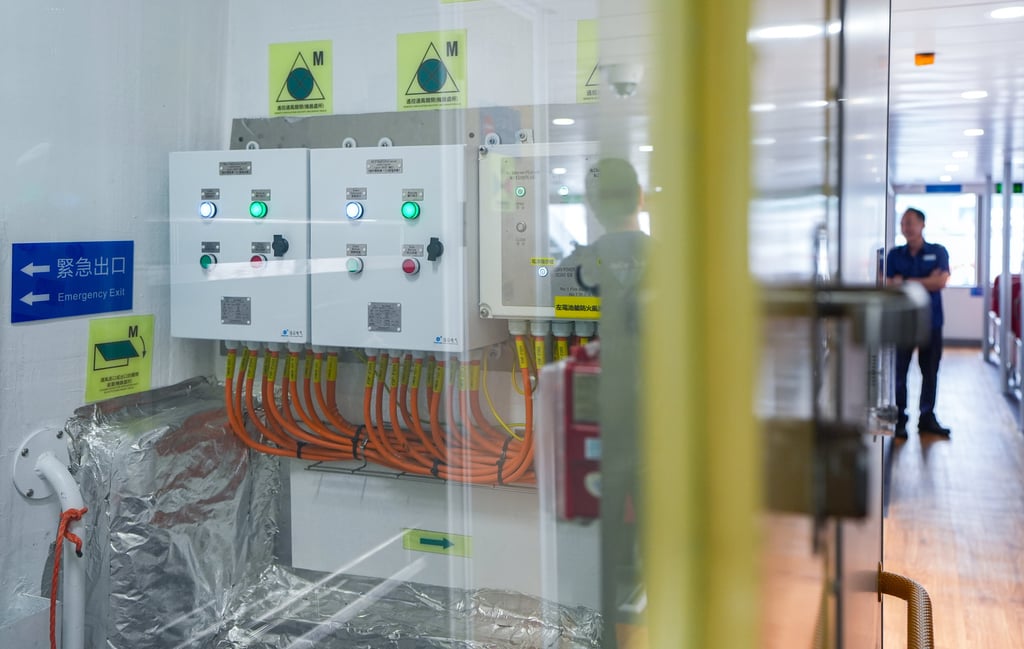新渡轮"新明珠XXXIX"的电池组,这是香港首艘电动载客渡轮。摄影:Eugene Lee