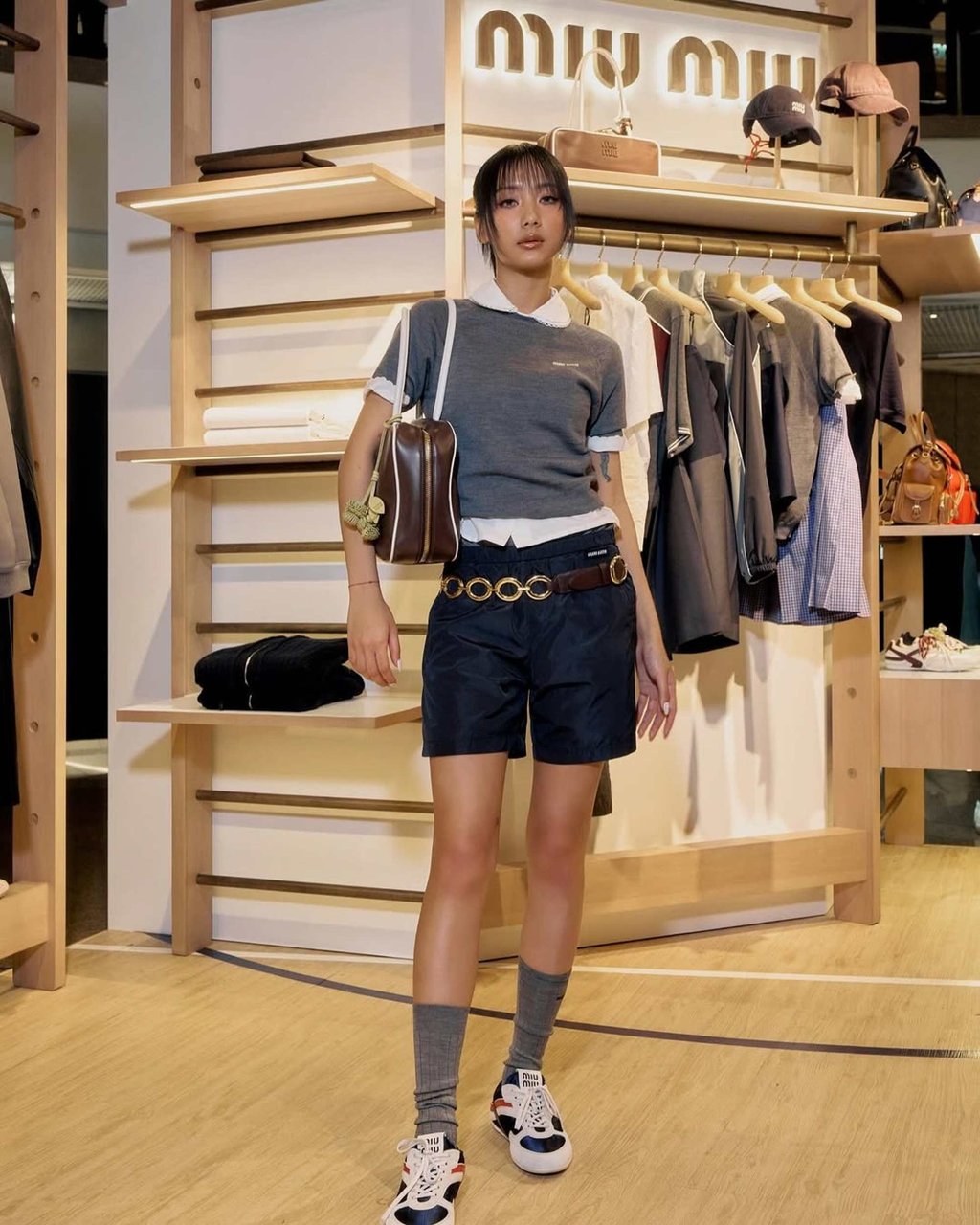 这是邱彦近期在二月份于海港城观看该品牌Gymnasium系列时穿着的缪缪造型。这套装扮包括一件灰色短袖毛衣,内搭有领白色纽扣上衣和海军蓝短裤。