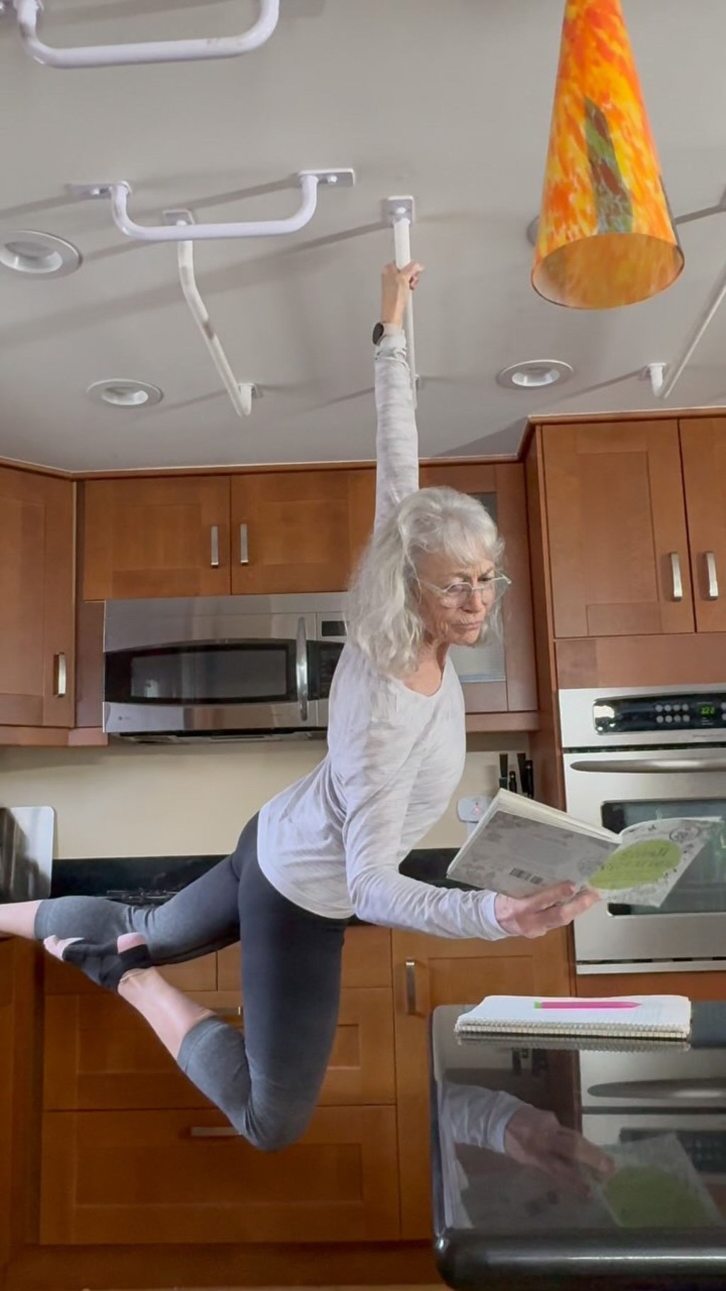 麦科尔甚至在厨房泡茶时也会利用安装的猴架"悬吊休息”。她在Instagram上写道:悬吊有益健康,而握力是长寿的生物标志物。图片来源:Instagram/ginnymaccoll