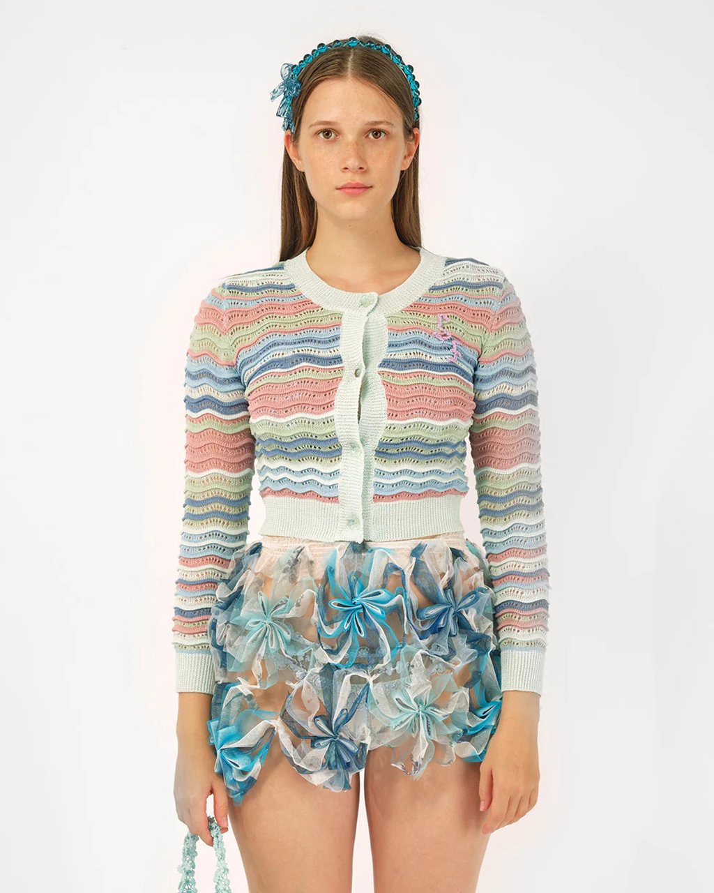 “我们真心希望呈现忠于内心的故事,“方妍楠谈及2025秋冬系列时说道。该系列灵感源自自然界无形的空气元素——设计师标志性的"空气编织"与"空气漩涡"工艺通过窄幅面料创造出立体廓形,极大减少了浪费——并与记忆中同样缥缈的特质形成呼应。多套惊艳造型沿袭这一主题,包括一款令人屏息的彩虹裙装,以朦胧飘逸的走秀效果或悬空定格姿态,完美诠释了品牌特有的轻盈空灵感。
