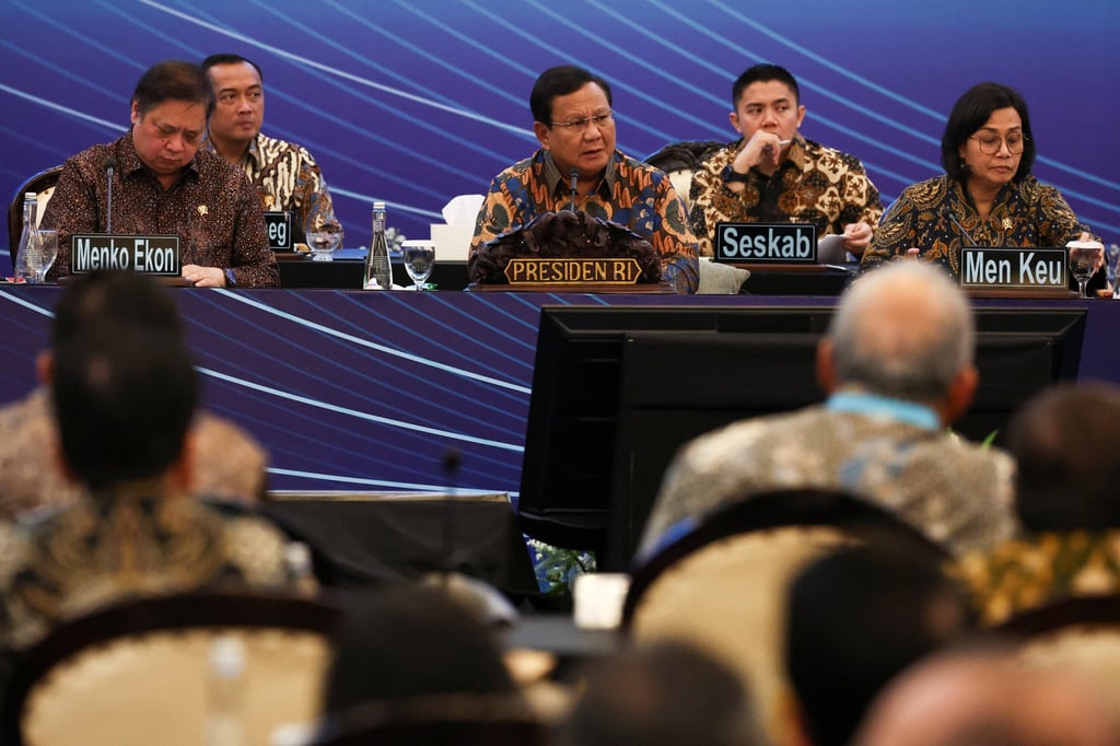 印尼总统普拉博沃·苏比安托4月8日在雅加达与经济界人士会面时发表讲话,其内阁部长陪同出席。照片:路透社