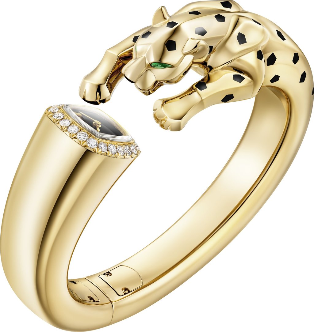 卡地亚Panthère珠宝腕表,黄金材质镶嵌钻石、沙弗莱石、缟玛瑙及黑漆工艺。图片:品牌提供