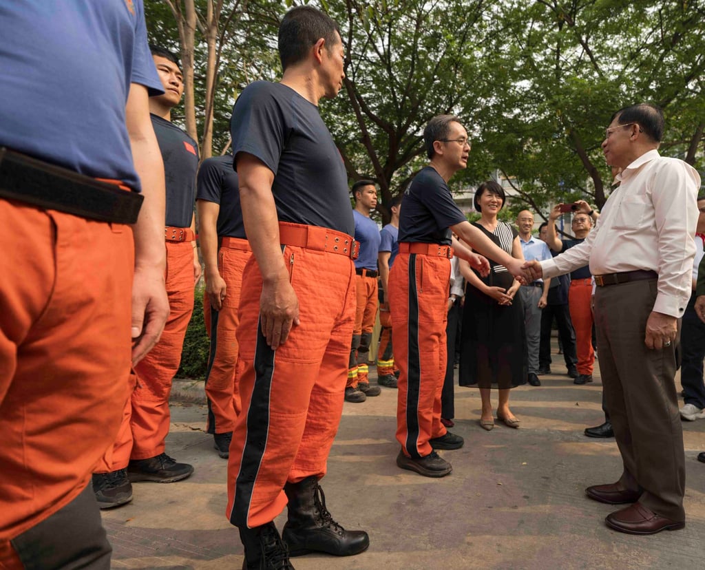 4月6日,敏昂莱(右)在缅甸曼德勒看望中国救援队。照片:新华社