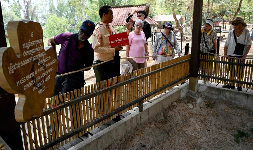 一名柬埔寨导游在金边琼邑克杀戮战场纪念地的大规模受害者墓旁向游客讲解。照片:法新社