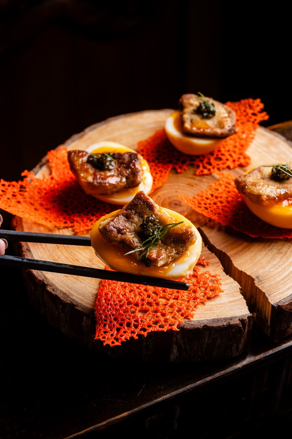 Yardbird以全鸡烧鸟闻名,其中最负盛名的必点菜当属配蛋黄酱的鸡肉丸串。这道菜总会引发食客们蘸酱时的拍照热潮——将鸡绞碎捏成丸状炭烤,佐以特调酱汁与整颗生蛋黄。店家会贴心指导食客将肉串蘸取蛋液混合享用。### 3. 胡同餐厅的上海炖蛋配鹅肝鱼子酱