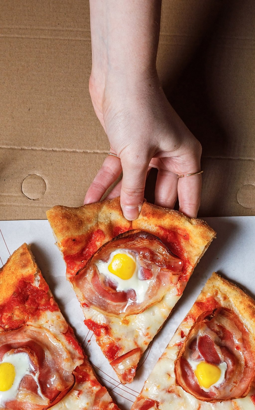 在披萨上放鸡蛋并非创举,但自2020年披萨工坊开业以来,其卡邦尼披萨堪称餐厅最具标志性的菜品。经典饼底铺满番茄酱、水牛乳酪、意式培根,每片披萨还配有一枚流淌的鹌鹑蛋。这是对早餐披萨的简约而美味的诠释,堪称一场鸡蛋的盛宴。