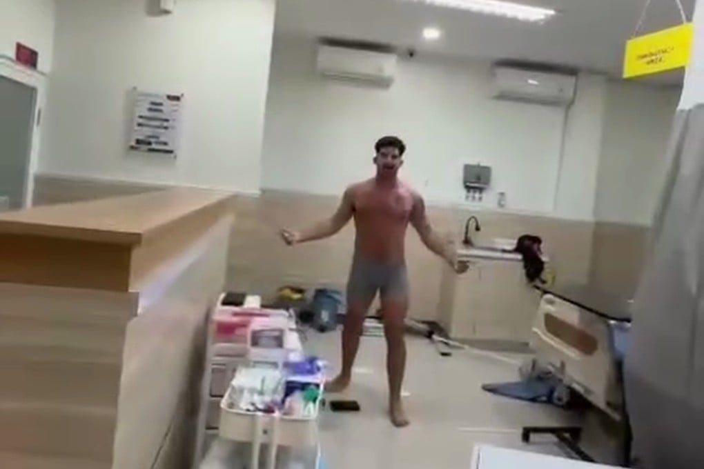 画面显示,在旅游胜地巴东的诊室里,这名仅着内裤的游客尖叫着推倒了医疗柜。