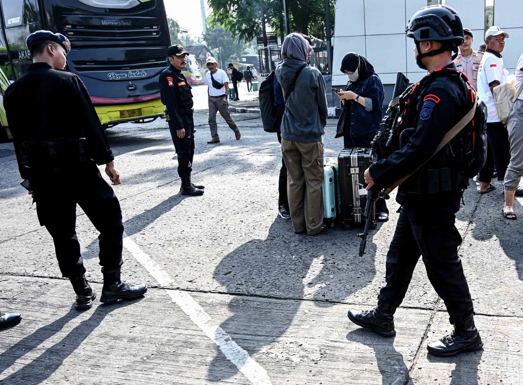 4月5日,印尼雅加达卡利德雷斯公交车站巡逻的警察。图片来源:新华社