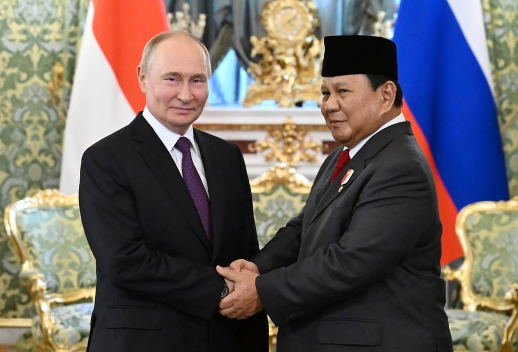 印度尼西亚的普拉博沃·苏比安托(右)去年在莫斯科克里姆林宫与俄罗斯总统弗拉基米尔·普京握手。照片:斯普特尼克,克里姆林宫通过美联社