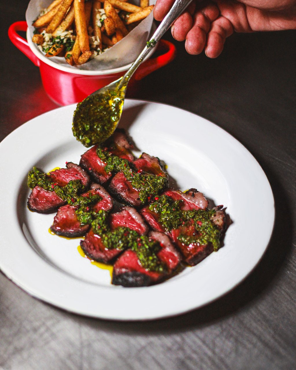 皮坎哈斯餐厅配阿根廷青酱的招牌牛排。图:皮坎哈斯