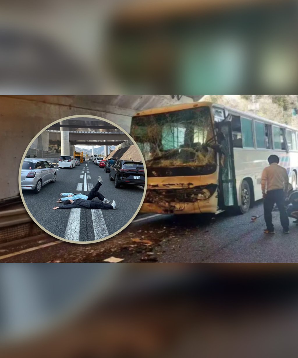 日本高速发生数十人受伤的巴士事故引发拥堵期间,两名中国女子躺地拍照的行为引发舆论谴责。图片来源:南华早报合成/红板报