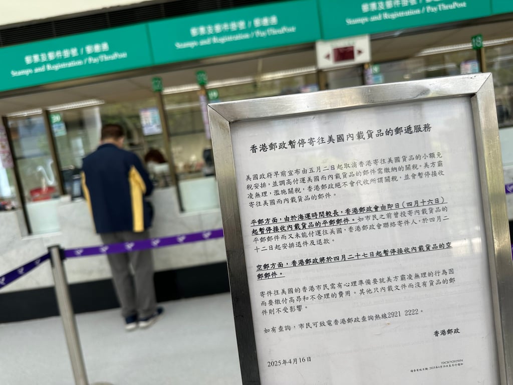香港邮政在中环邮政总局张贴通告,宣布即时(4月16日)起暂停接收寄往美国的平邮包裹,空邮包裹则自4月27日起暂停收寄。图:Jelly Tse