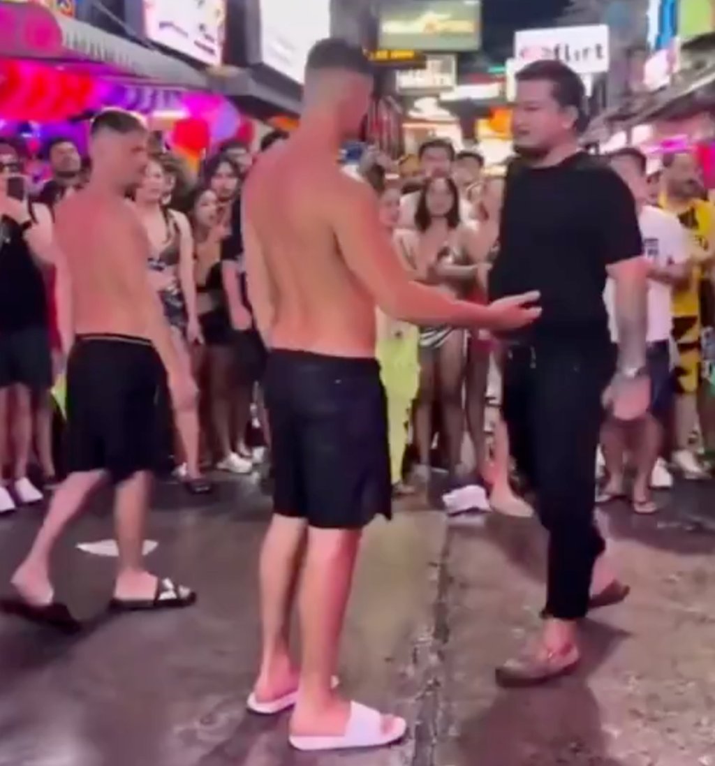 一名游客在泰国酒吧外向保安发起泰拳挑战。图片来源:X/patrickallsyms