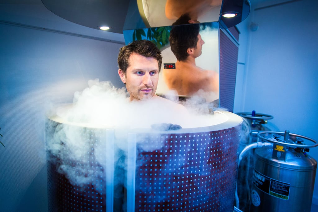 一名男子在全身冷冻治疗舱内。冷冻疗法使用汽化液氮或一氧化二氮将皮肤表面温度降至零下100摄氏度(零下148华氏度)以下。照片:资料图