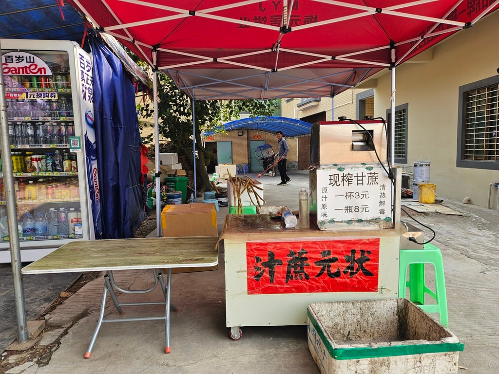 米里岭村一个售卖状元甘蔗汁的摊位。照片:Coco Feng