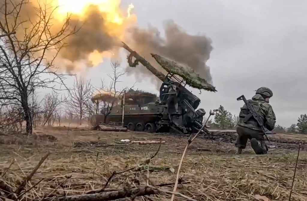 这段上月发布的视频画面中,一门俄罗斯152毫米自行火炮正向乌克兰阵地开火。图片来源:俄罗斯国防部新闻处/EPA-EFE