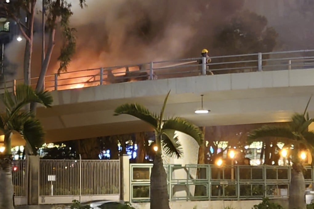 周日夜间,香港铜锣湾购物区一座高架桥上,一辆行驶中的车辆突然起火并发生多次爆炸。