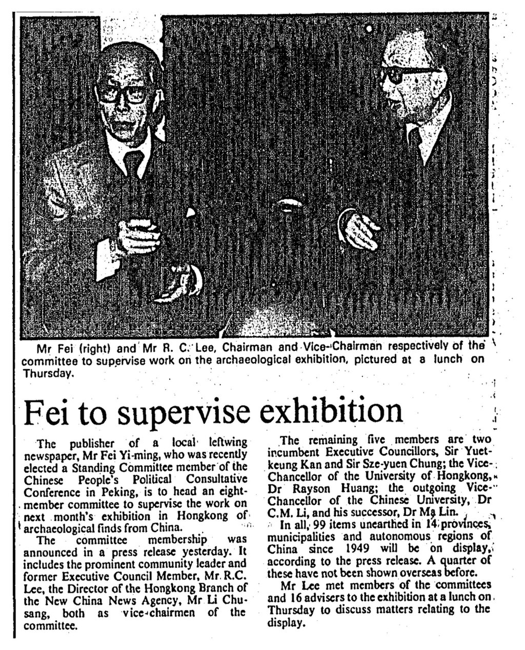 “香港左翼报纸《大公报》的出版人费彝民先生,最近当选为北京中国人民政治协商会议常务委员会委员,将领导一个八人委员会,监督下个月在香港举行的中国考古发现展览工作,”《南华早报》在1978年3月25日报道。“根据新闻稿,自1949年以来在中国14个省、市和自治区出土的99件物品将展出。”