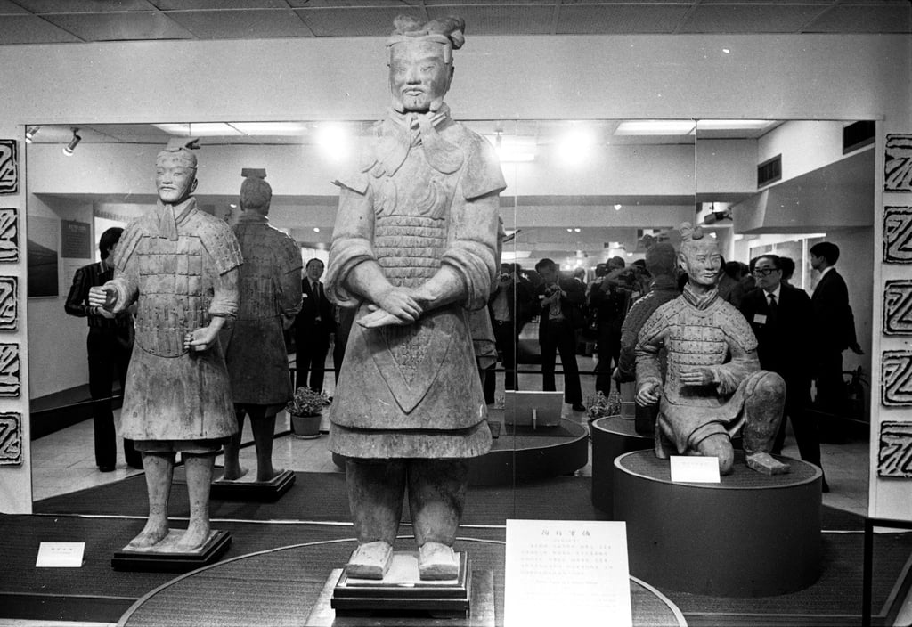 1978年在星光行举行的中国考古发现展览上展出的三尊秦朝真人尺寸陶俑。图片来源:南华早报档案