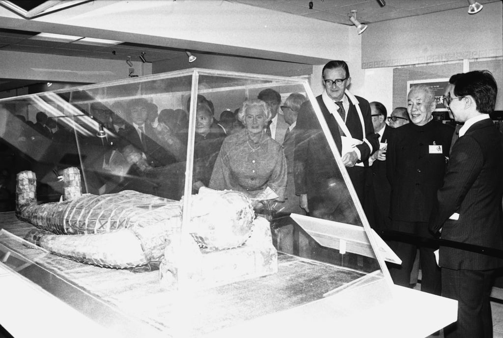 1978年星光行展览期间,总督麦理浩爵士(右三)、麦理浩夫人(右四)和中国文物管理局局长王冶秋(右二)观看著名的玉衣。照片:南华早报档案