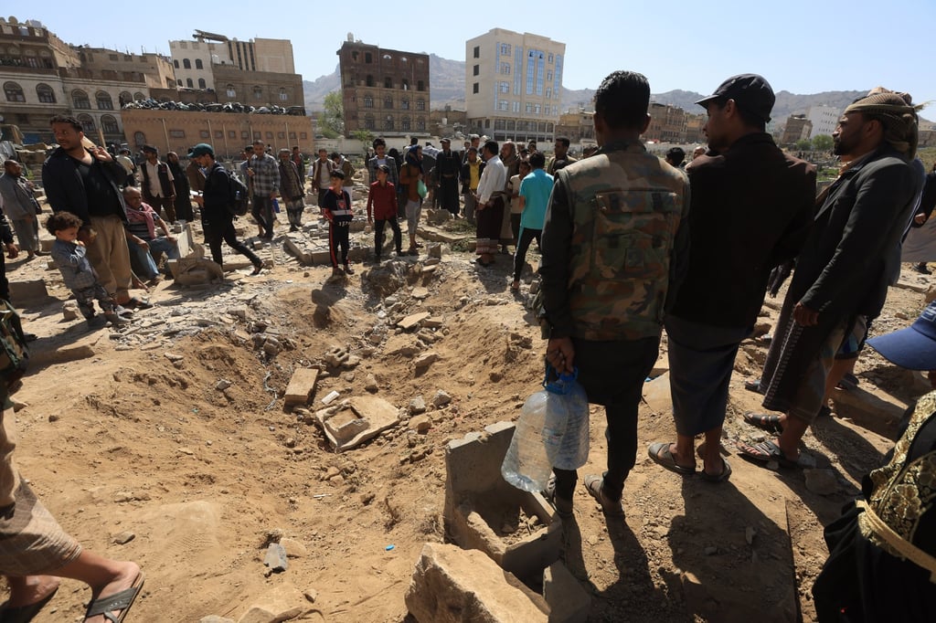 4月21日周日,也门萨那,民众查看美军空袭墓地后的现场。图片来源:EPA-EFE