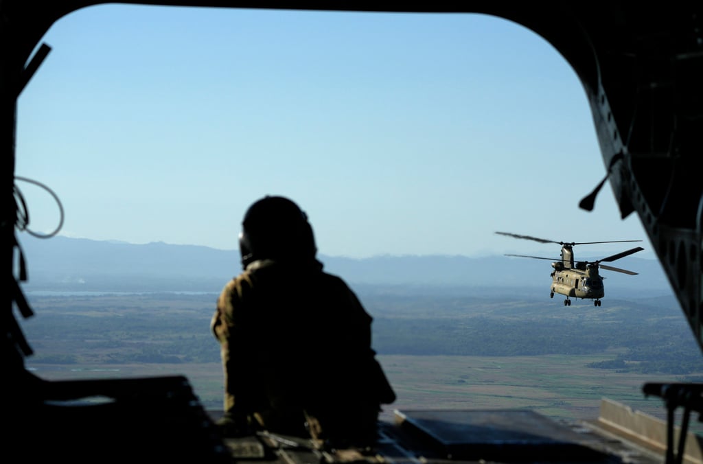 去年五月联合军演期间,美军CH-47直升机飞越卡加延省上空。根据《加强防务合作协议》,该省设有美军基地。图:美联社