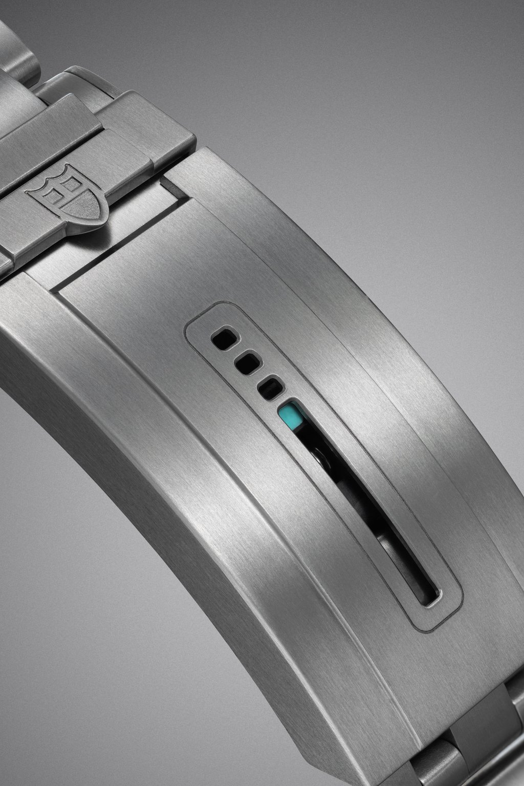 因此,表圈还采用了X1级和BGW9瑞士Super-LumiNova夜光材料,分别呈现绿色和蓝色,以便佩戴者在深水中更好地区分小时和分钟。二级钛金属表链不仅配备了专利“T-fit”带扣调节系统便于操作,扣位还设有独立指示标记以提升辨识度。