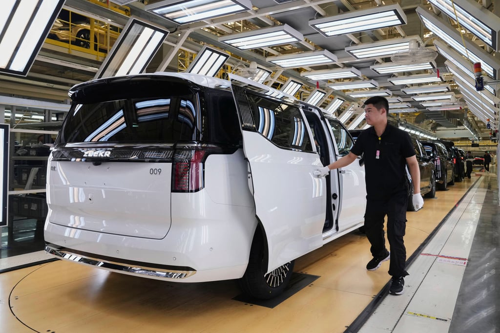 2025年4月16日,工作人员在浙江宁波极氪汽车总装厂对电动车进行最终检测。美联社照片