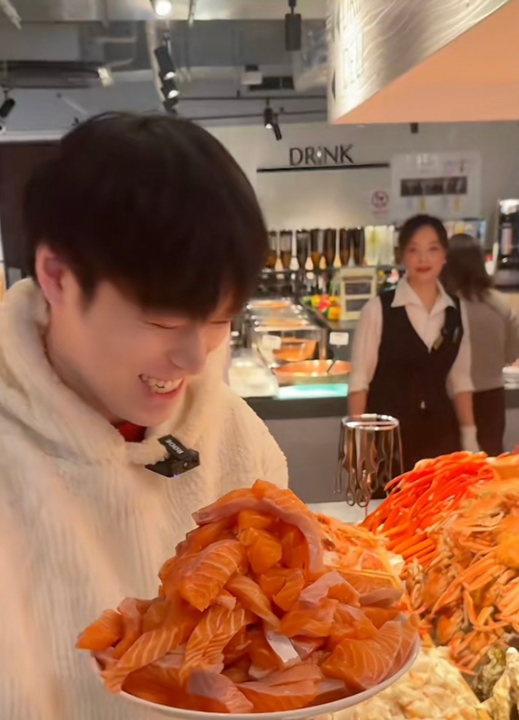 邓宸恩在日本某餐厅盯着一大盘生鲑鱼。来源:抖音