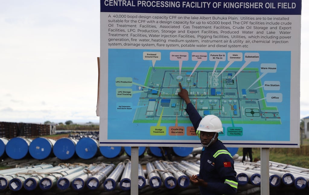 一名工人展示乌干达基库贝地区翠鸟油田中央处理设施的示意图。图片来源:新华社