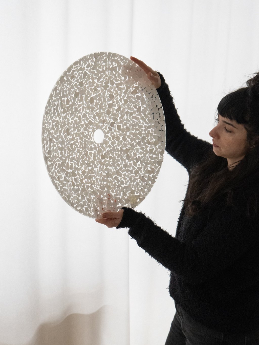 Yellowdot工作室合伙人Dilara Kan手持"Hatch"落地灯部件。照片:Yellowdot