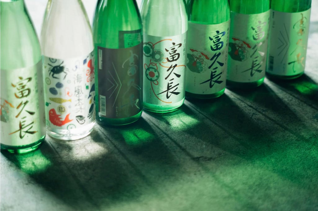 今田酒造的海鲜纯米清酒(左二)与其他品种的清酒。照片:今田酒造