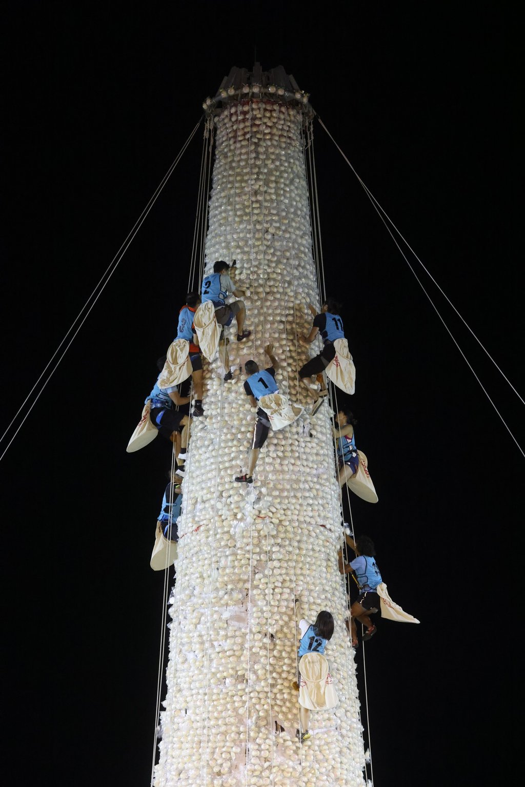 一年一度的长洲太平清醮活动中,参赛者攀爬竹制包山争夺平安包仿制品。摄影:Yik Yeung-man