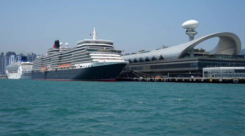 上月停泊在香港启德邮轮码头的伊丽莎白女王号(前景)和挪威天空号邮轮。摄影:Sam Tsang