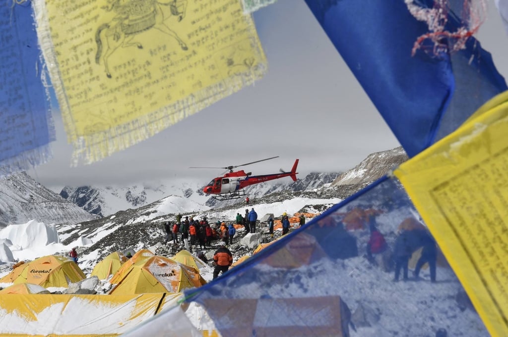 经幡环绕的救援直升机正从尼泊尔珠峰大本营运送伤员。照片:法新社