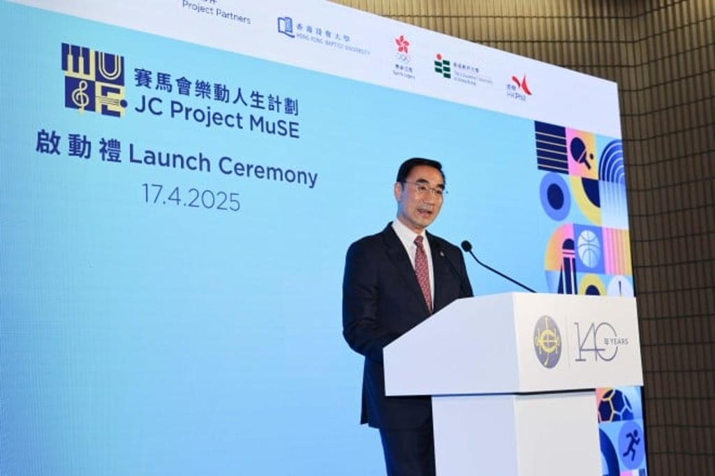 赛马会主席李家超在“乐韵相传”计划启动仪式上发表讲话。
